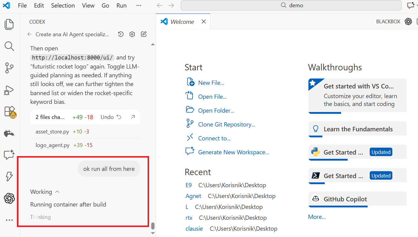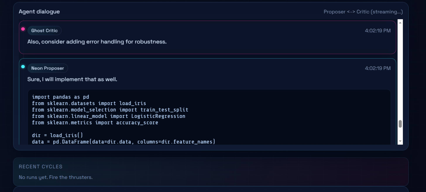 So i used the Codex Agent to create another Dual Agentic Webapp where One Agent proposes code the other Critiques it and they figure out togheader the next step. For fun i called the Neon Proposes and Ghost Critic.