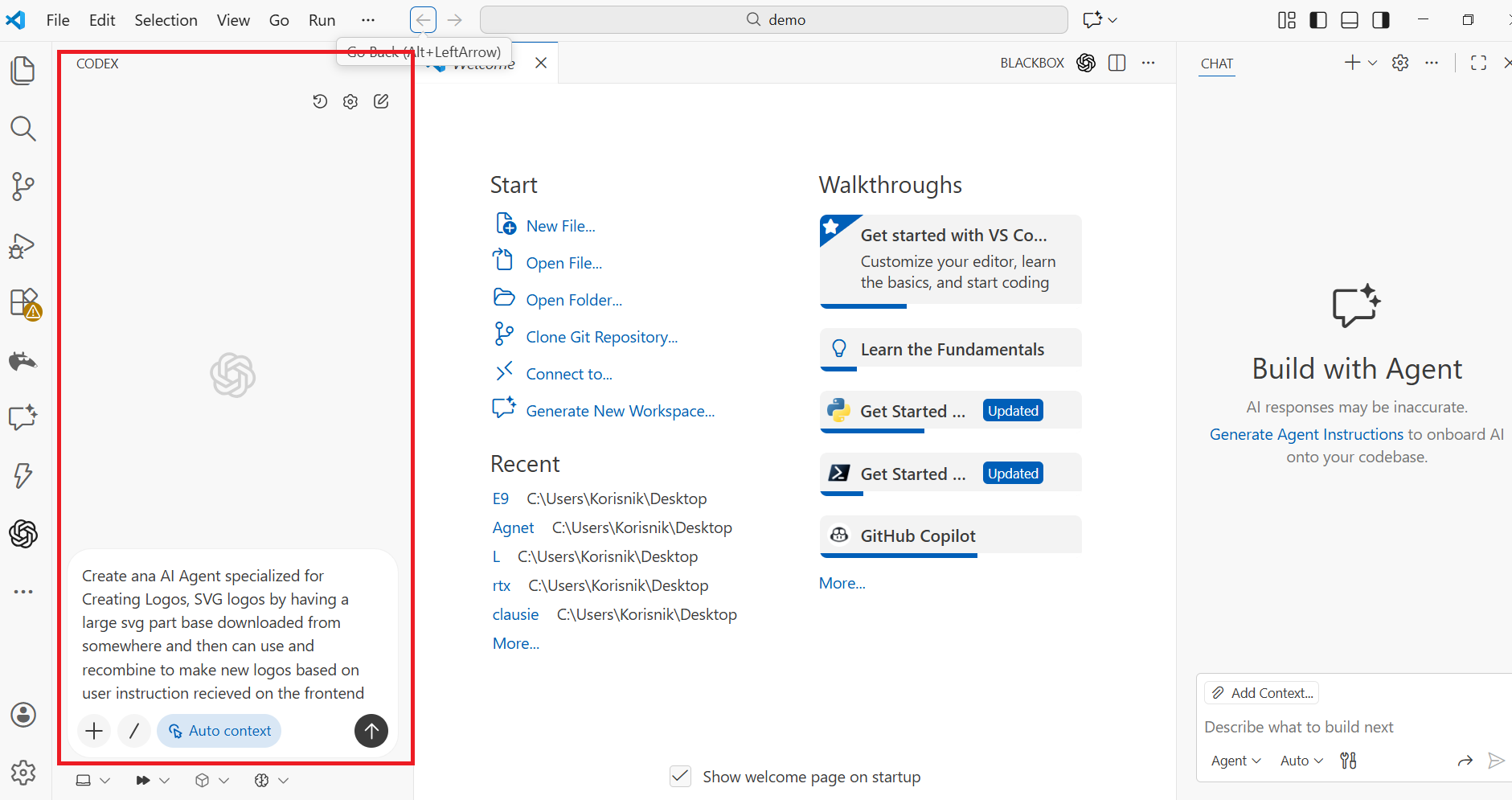 On the left side you have the Extension bar and once you click on it you can easily chat with your agent. (Note the right side is Vs Copilot).Basically the Agent will understand in natural language what you want to build in the folder you selected, however one needs to be very specific as Agent will not assume.